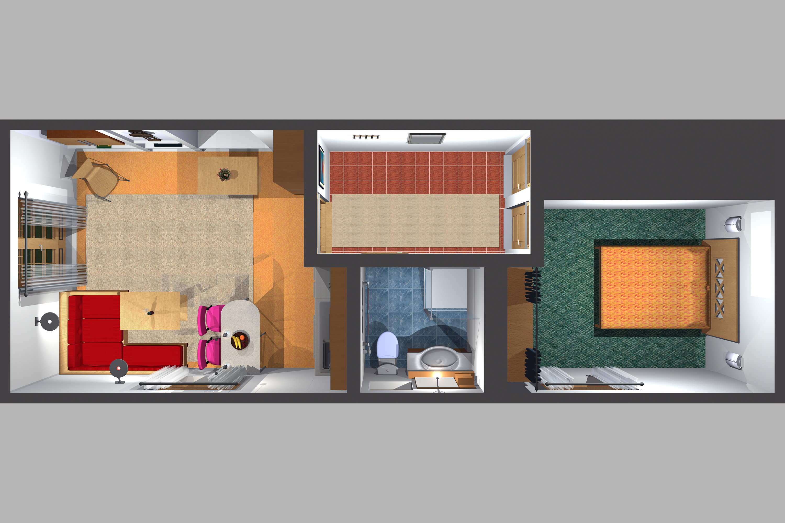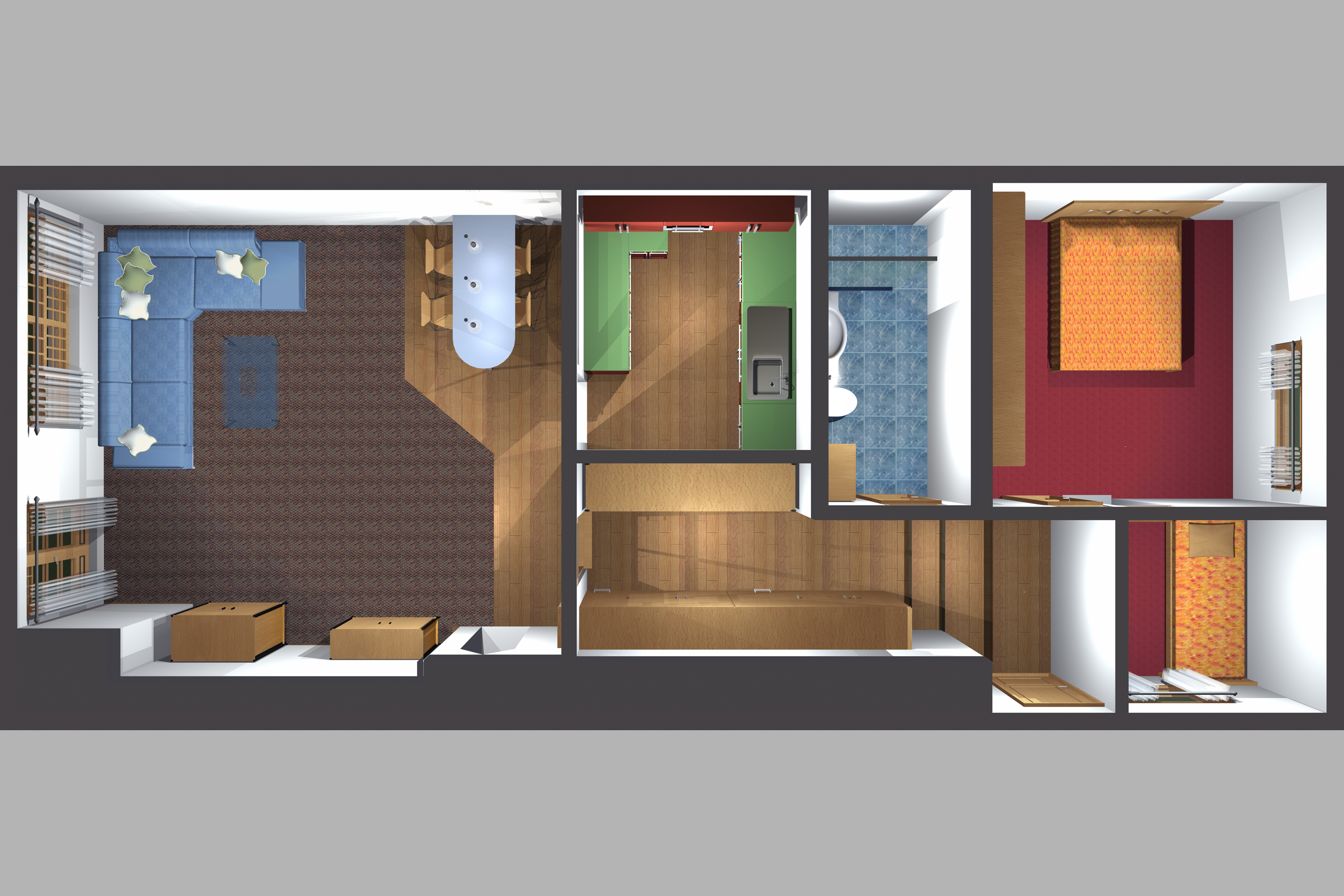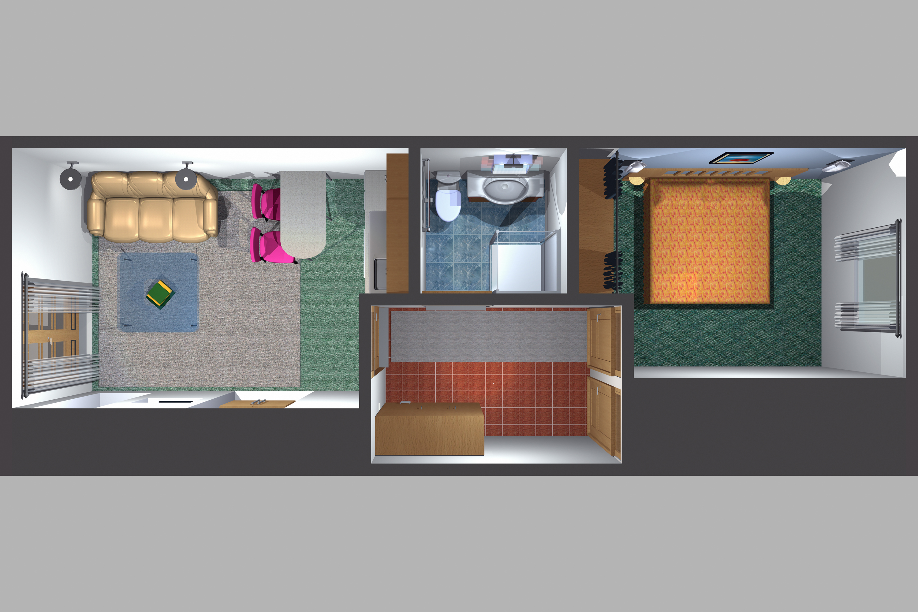 Betten sind bezogen Doppelbett Einzelbett Kleiderschrank Separates Schlafzimmer Wohn-/Schlafraum getrennt